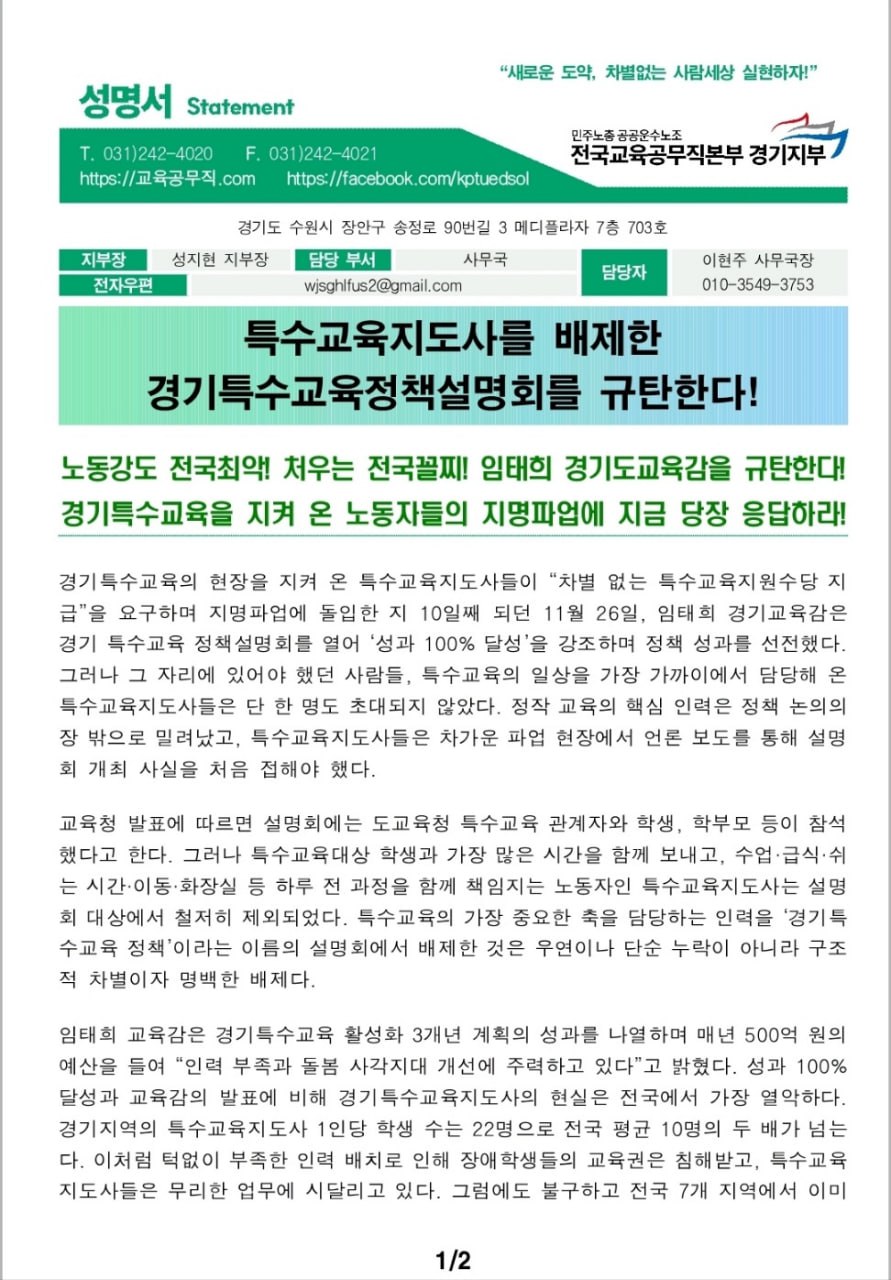[경기지부 성명] 특수교육지도사를 배제한 경기특수교육정책설명회를 규탄한다!