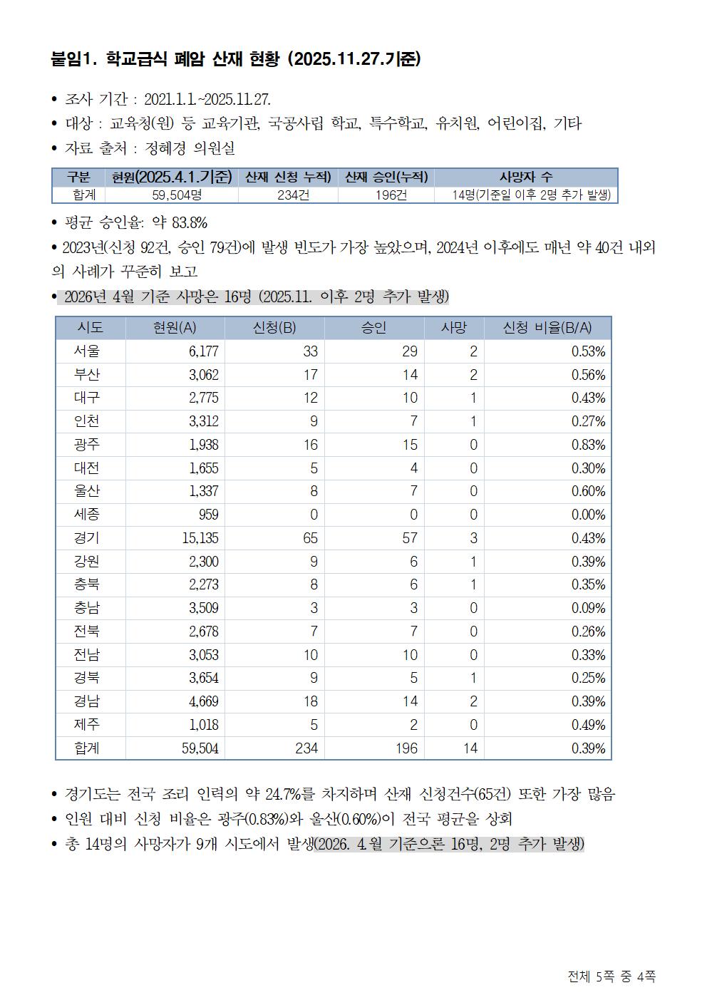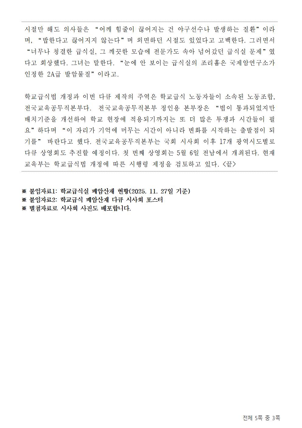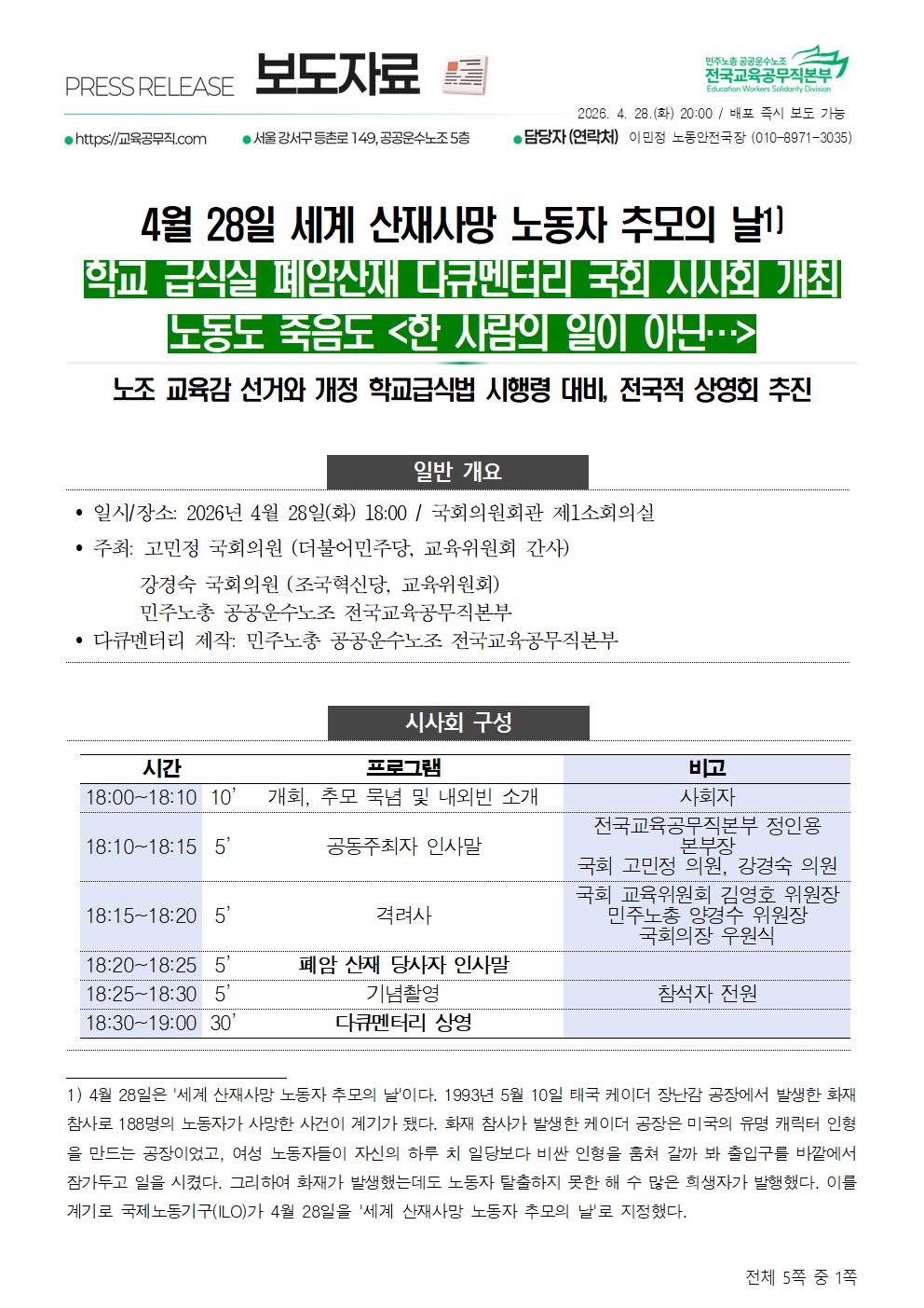 [보도자료] 4.28 세계 산재사망 노동자 추모의 날, 학교 급식실 폐암산재 다큐 국회 시사회