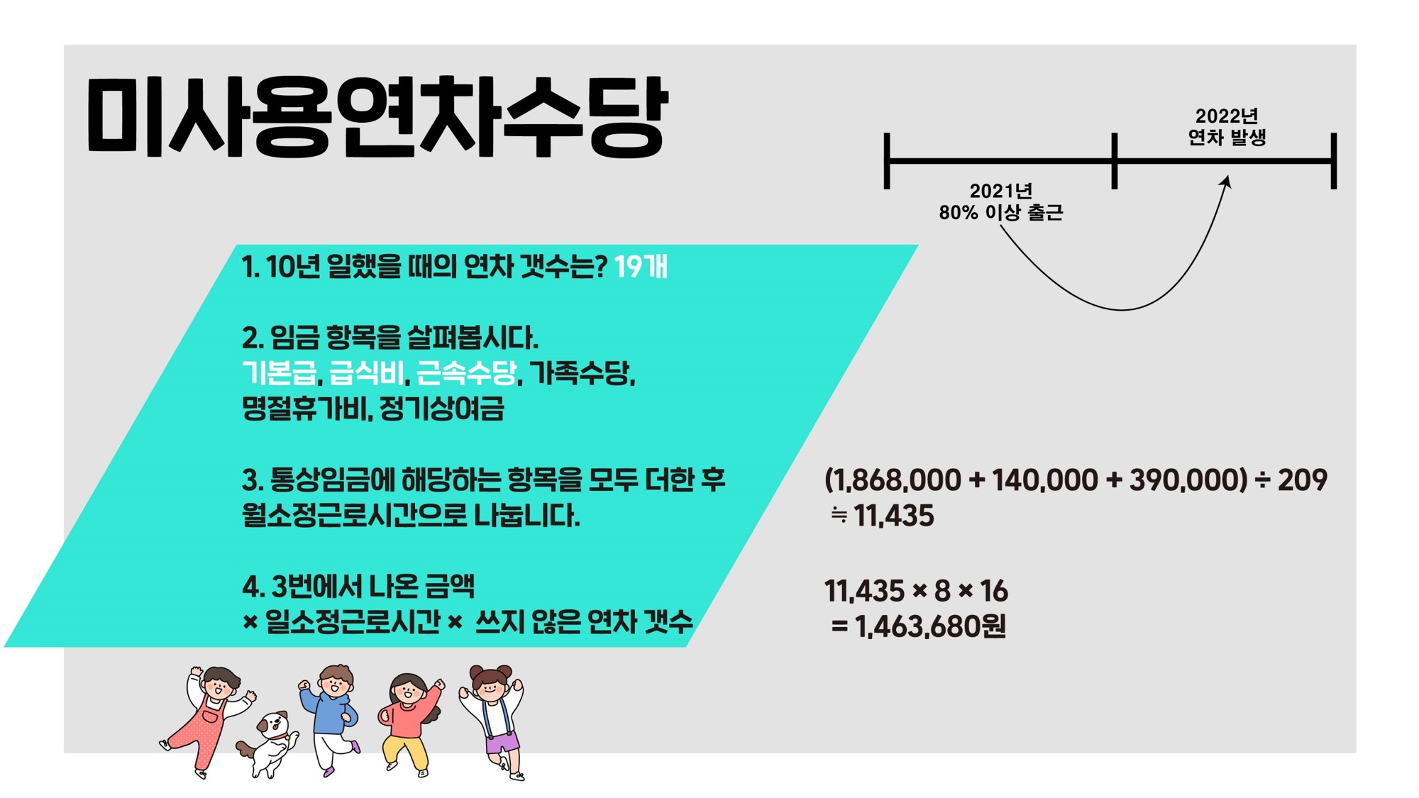 통상임금은 보통 시급으로 많이 산정됩니다. 나의 통상임금 × 일소정근로시간 × 사용하지 않은 연차일수 = 내가 받을 미사용연차수당 액수가 됩니다.