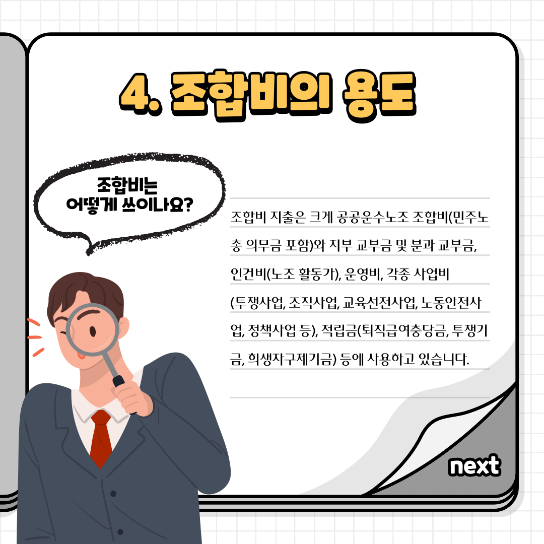 조합원이 납부하는 조합비는 조합원의 처우와 사회적 지위 향상을 위한 다양한 사업과 투쟁에 사용됩니다. 공공운수노조 조합비, 지부 교부금 및 분과 교부금, 노조 활동가 인건비, 운영비, 투쟁·연대·조직·정책·교육·선전사업비, 적립금(퇴직급여충당금, 투쟁기금, 희생자구제기금) 등에 사용하고 있습니다.