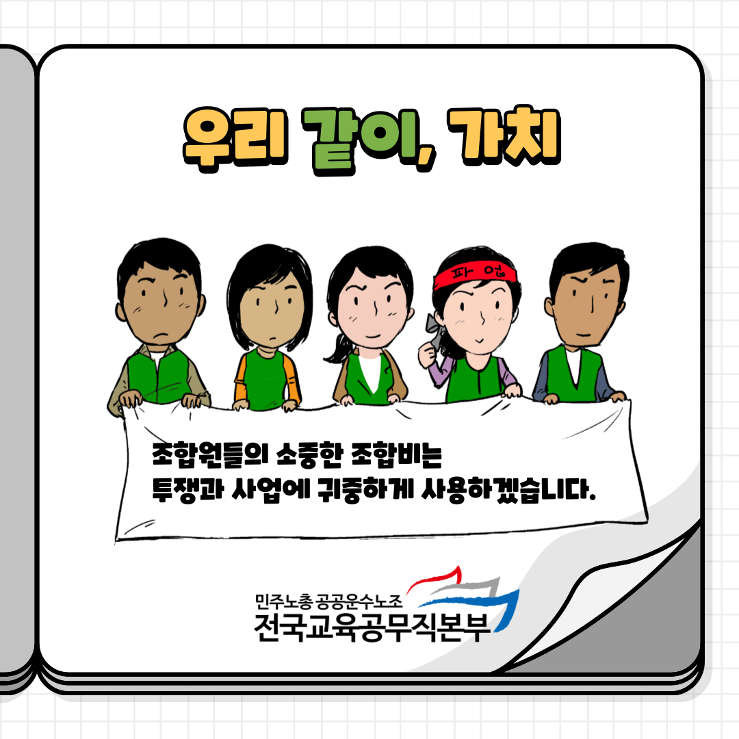 전국교육공무직본부는 비정규직 차별철폐 투쟁을 선도해 왔습니다. 올해에도 조합원이 납부한 조합비가 더 값진 성과를 거둘 수 있도록 노력하겠습니다.
