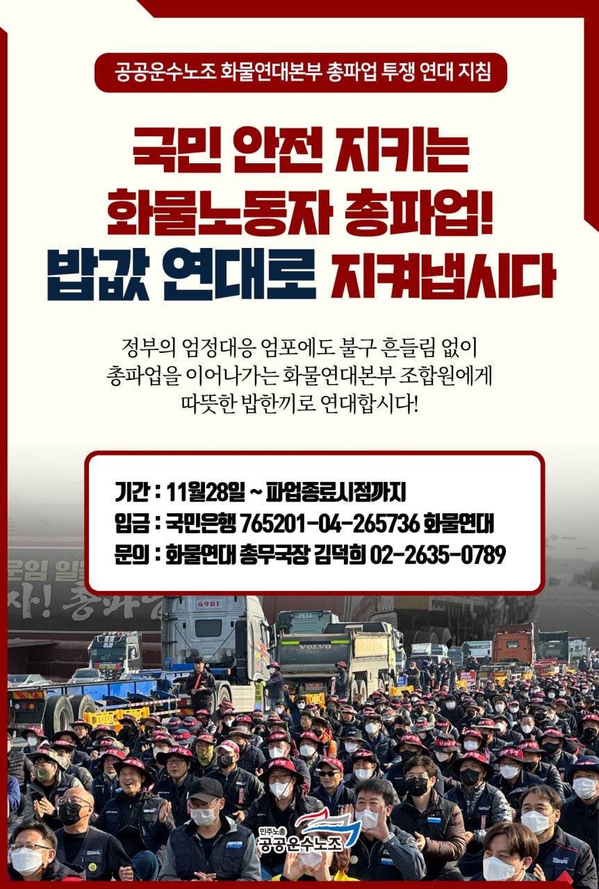 정부의 업무개시명령에도 굴하지 않고 투쟁을 이어가는, 국민 안전을 지키는 화물노동자들에게 연대의 밥값으로 함께 합시다!