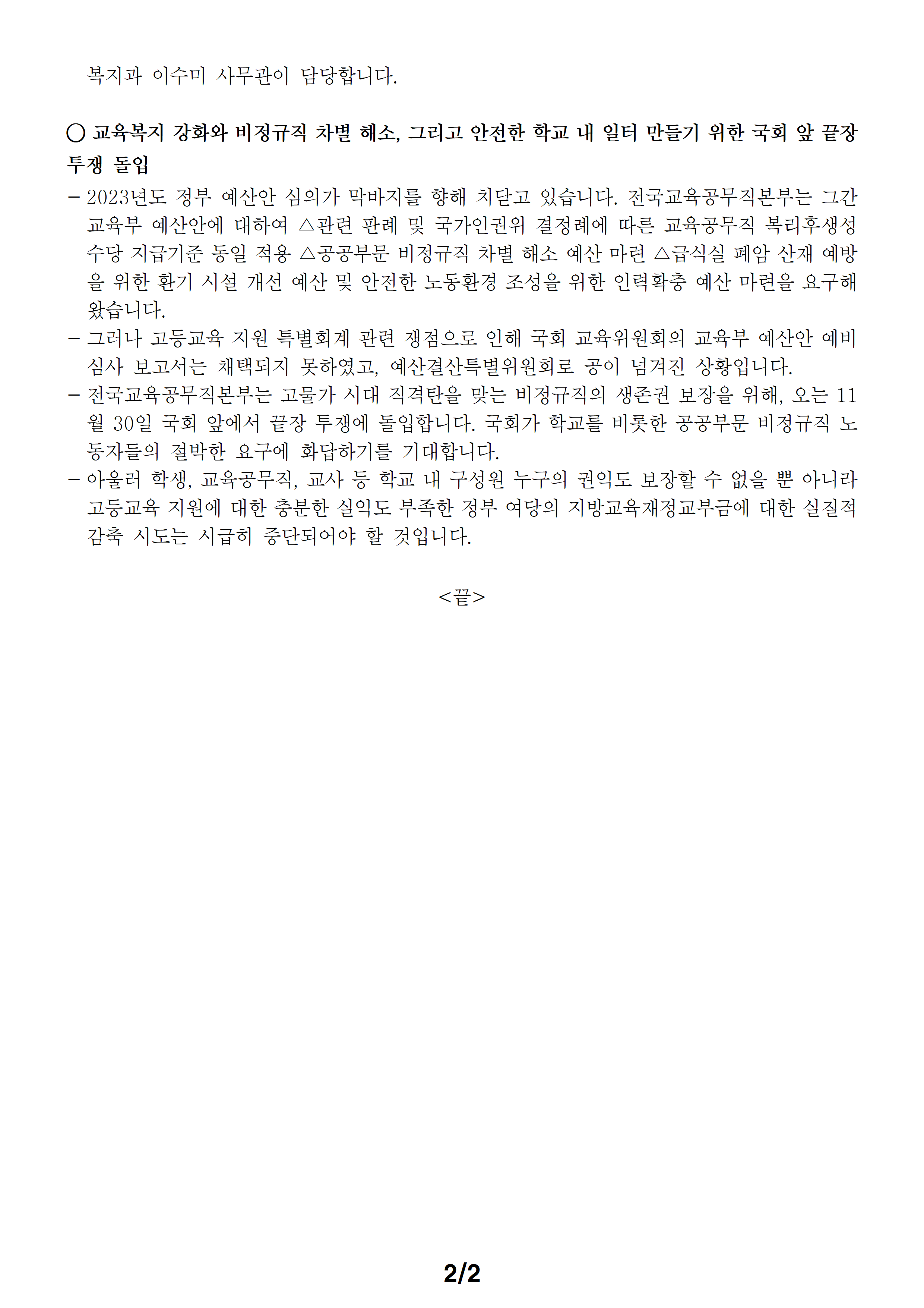 - 교육복지 강화와 비정규직 차별 해소, 그리고 안전한 학교 내 일터 만들기 위한 국회 앞 끝장 투쟁 돌입