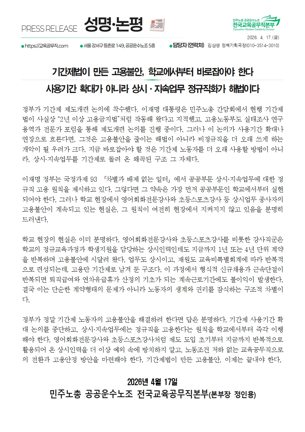 [성명] 기간제법이 만든 고용불안, 학교에서부터 바로잡아야 한다