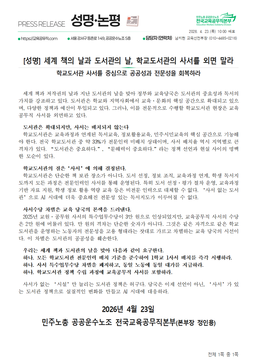 [성명] 세계 책의 날과 도서관의 날, 학교도서관의 사서를 외면 말라