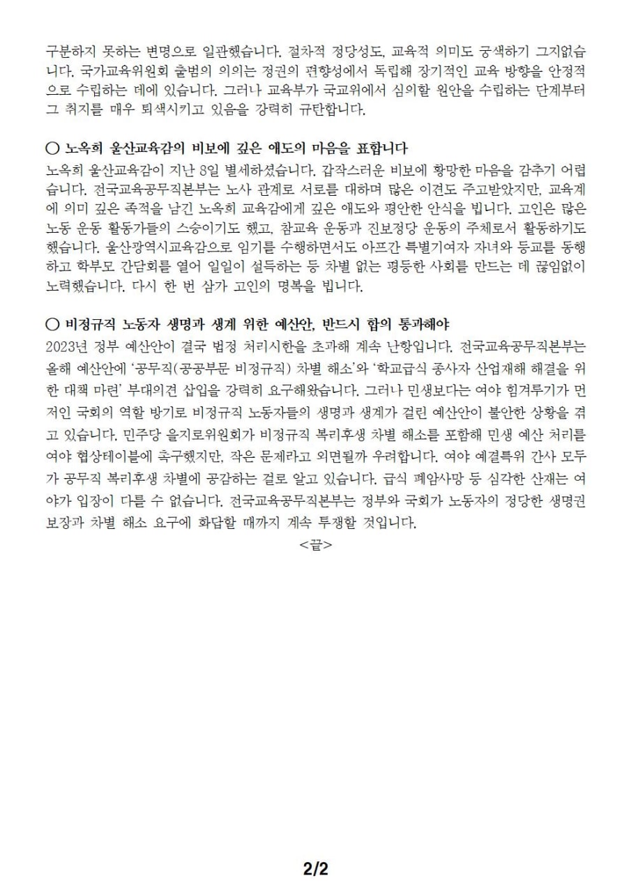 - 노옥희 울산교육감의 비보에 깊은 애도의 마음을 표합니다